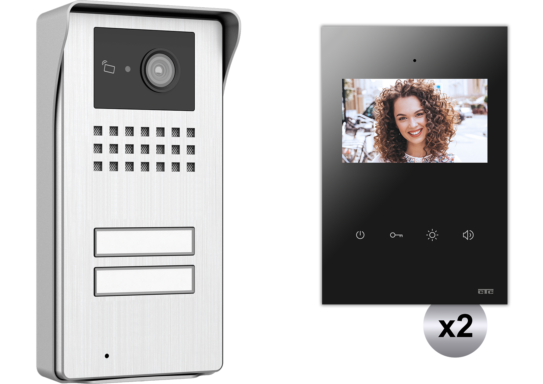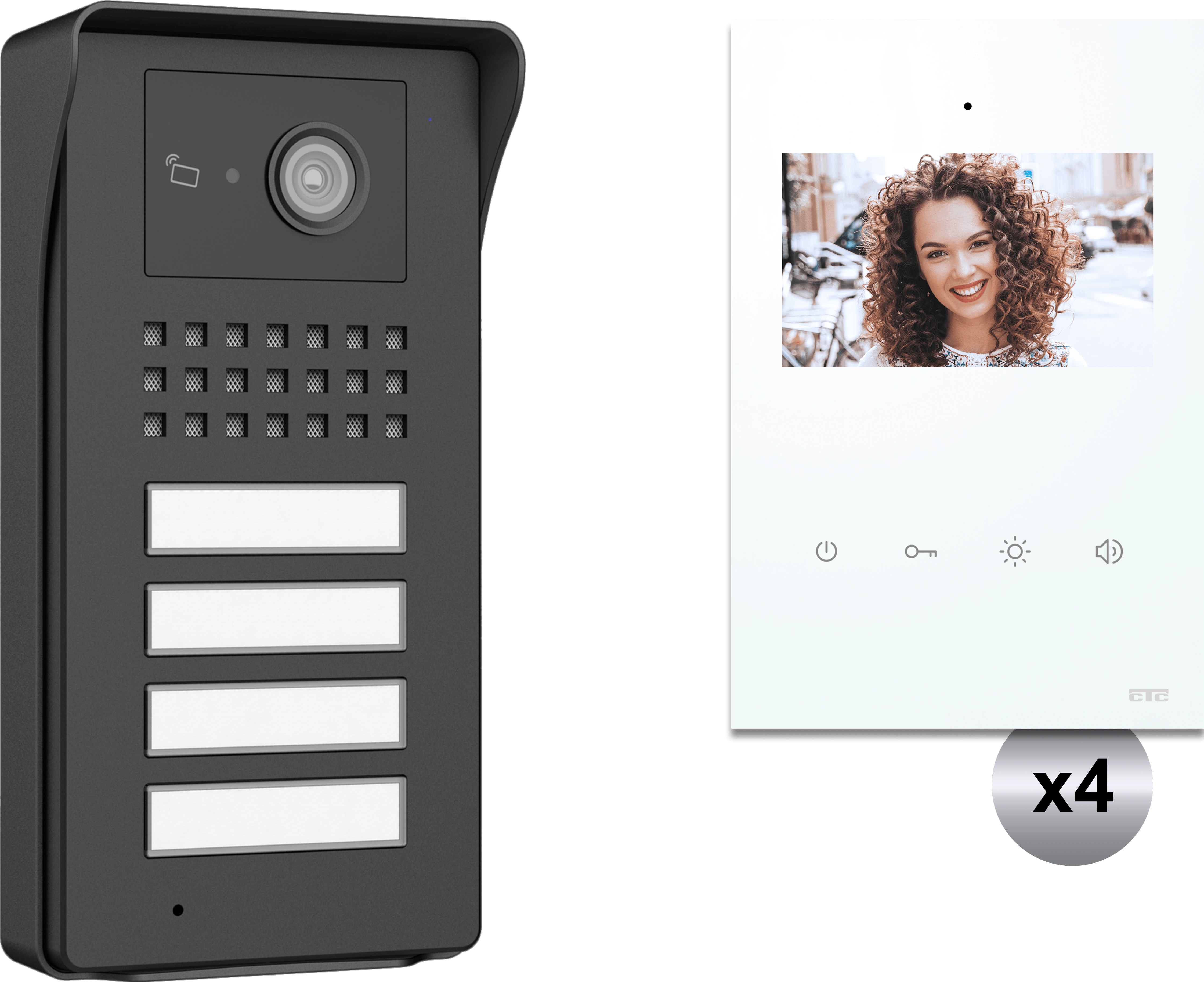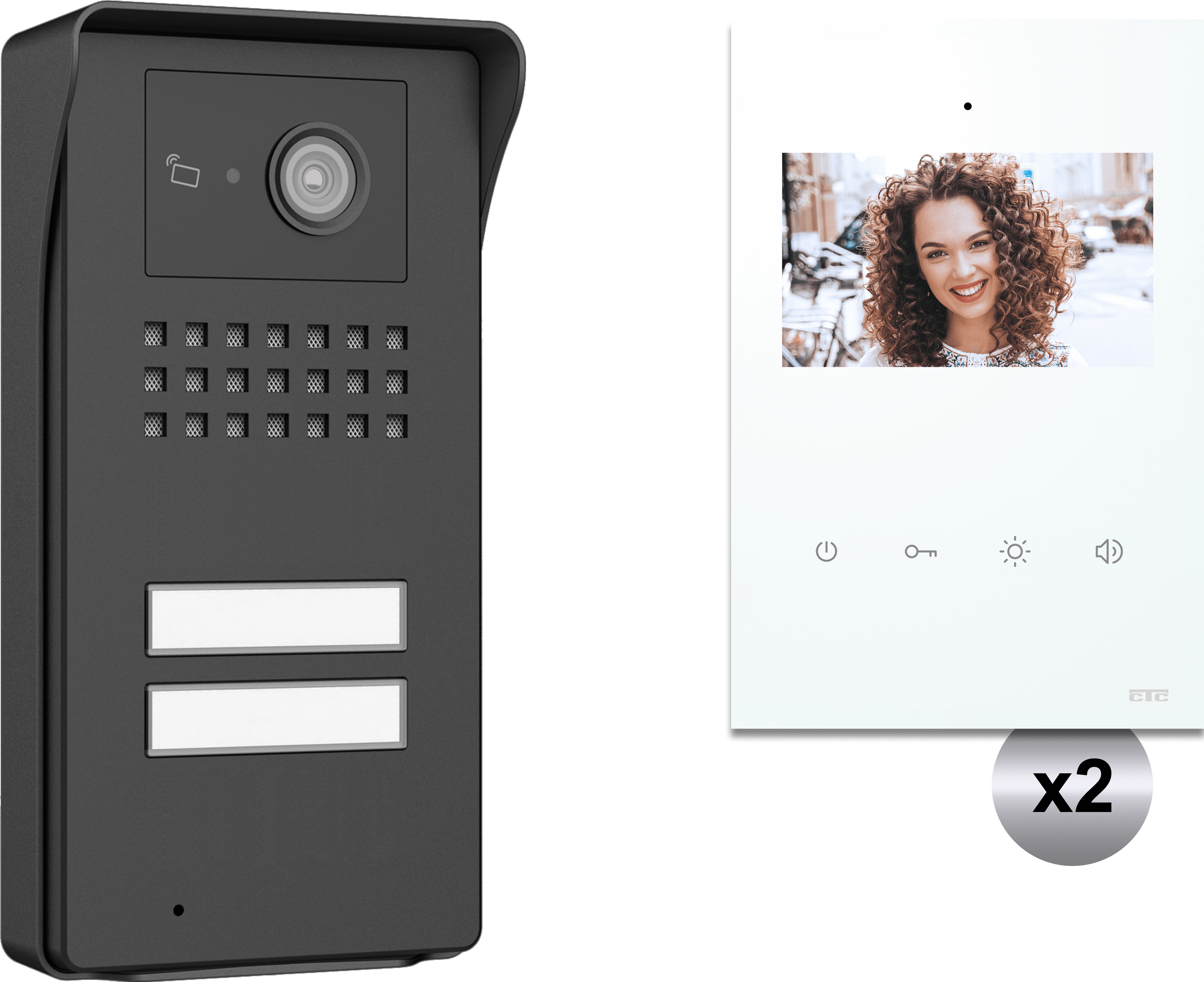 Τα kit θυροτηλεόρασης 2 καλωδίων αποτελούνται από μπουτονιέρα και θυροτηλεοράσεις 4,3", καλύπτοντας τις ανάγκες από 1 (ένα) έως και 4 (τέσσερα) διαμερίσματα.
