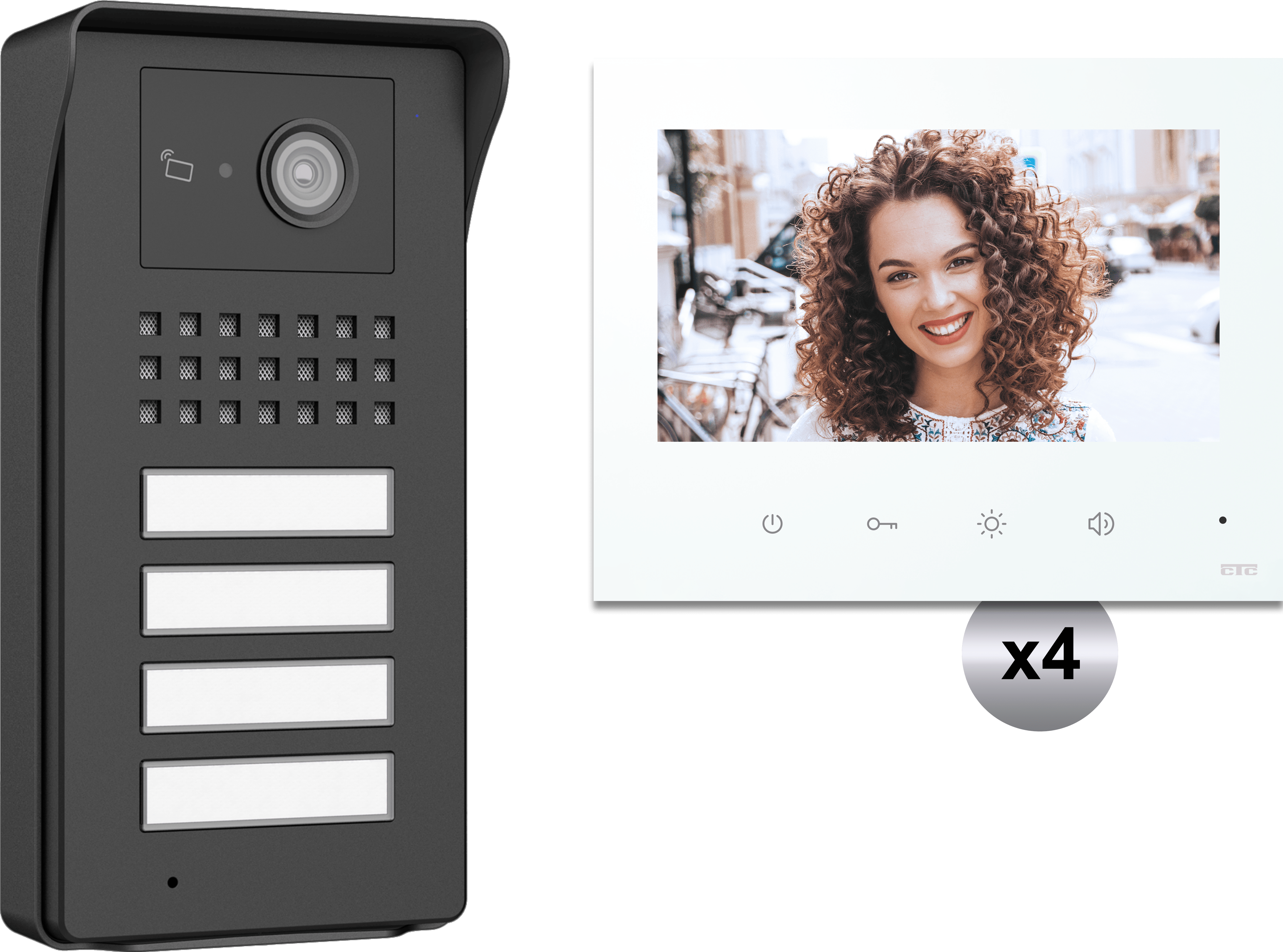 Τα kit θυροτηλεόρασης 2 καλωδίων αποτελούνται από μπουτονιέρα και θυροτηλεοράσεις 7", καλύπτοντας τις ανάγκες από 1 (ένα) έως και 4 (τέσσερα) διαμερίσματα.